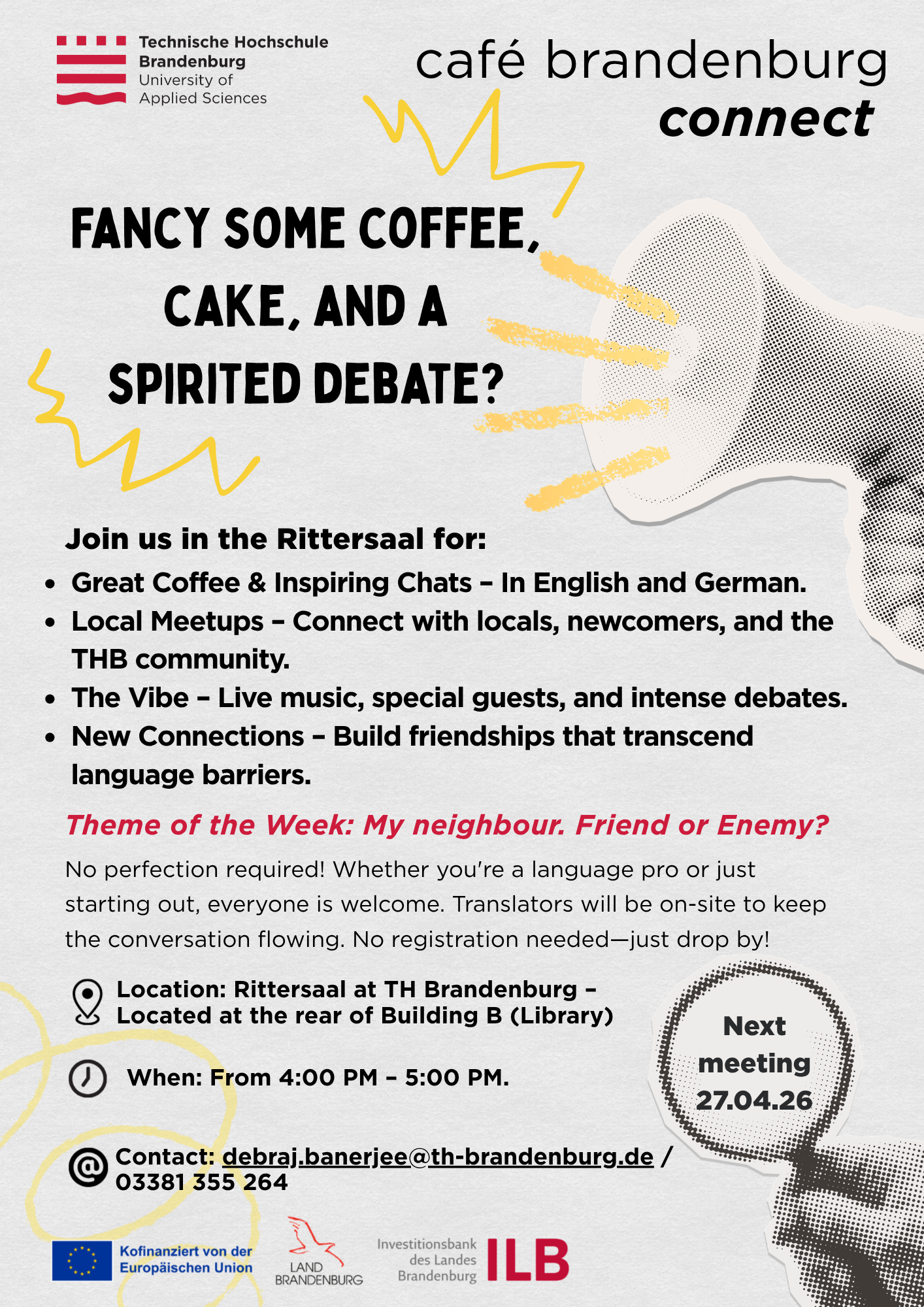 The language cafe serves as the hub for extracurricular German language learning. The Café Brandenburg Connect facilitates German-English exchanges between students of Brandenburg University of Applied Sciences and residents of the region. The regular meetings foster networking both within and outside the university and help build a sense of community.